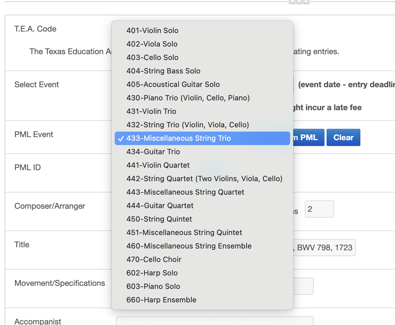 - Click on Select from PML to pull up a list of all music for the selected event, and then choose the Grade of the musical selection that entry will be playing.