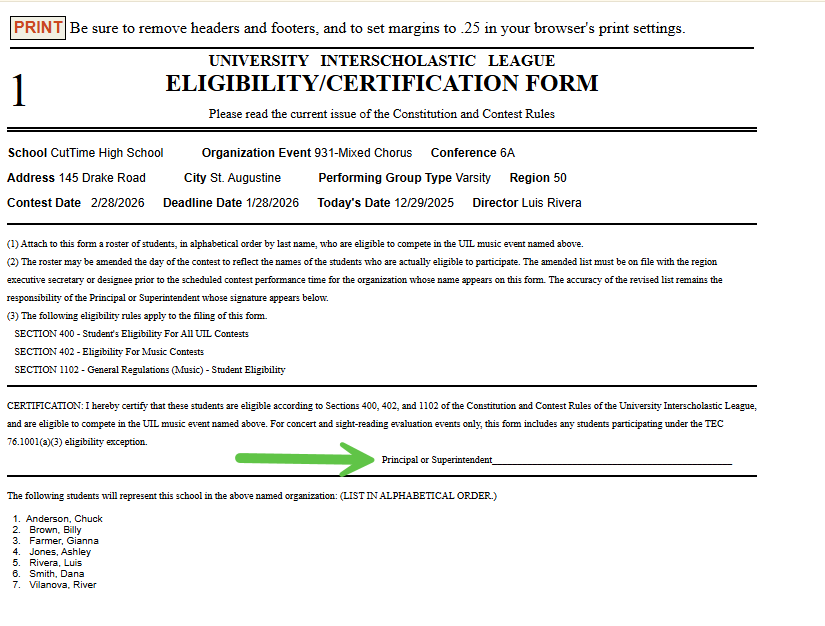 The Form 1 Eligibility Certification is required for every UIL Music event in which you plan to enter students. The form must be printed and signed by your principal or superintendent, and must be turned in to your Region Executive Secretary either on or immediately before the day of the event.