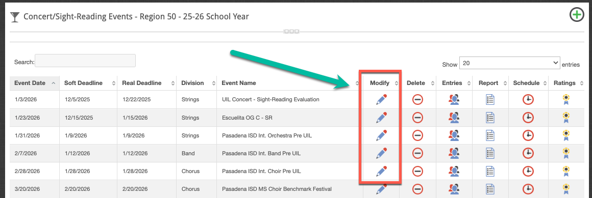 To update details for an existing Concert and Sight-Reading event, locate the event you want to modify and click the pencil icon to the right of the event name.