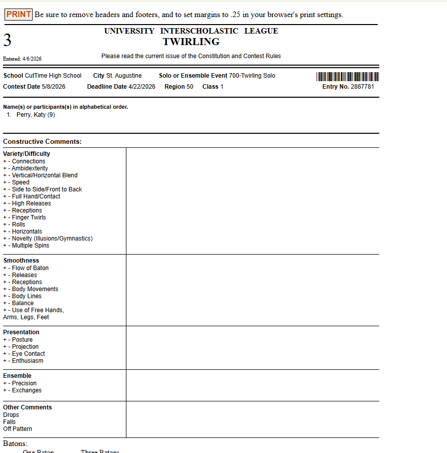 The Form 3 Twirling form is the entry form to participate in UIL Twirling Events. The events are set up by the Region Executive Secretaries and are specific to your Region and Conference.