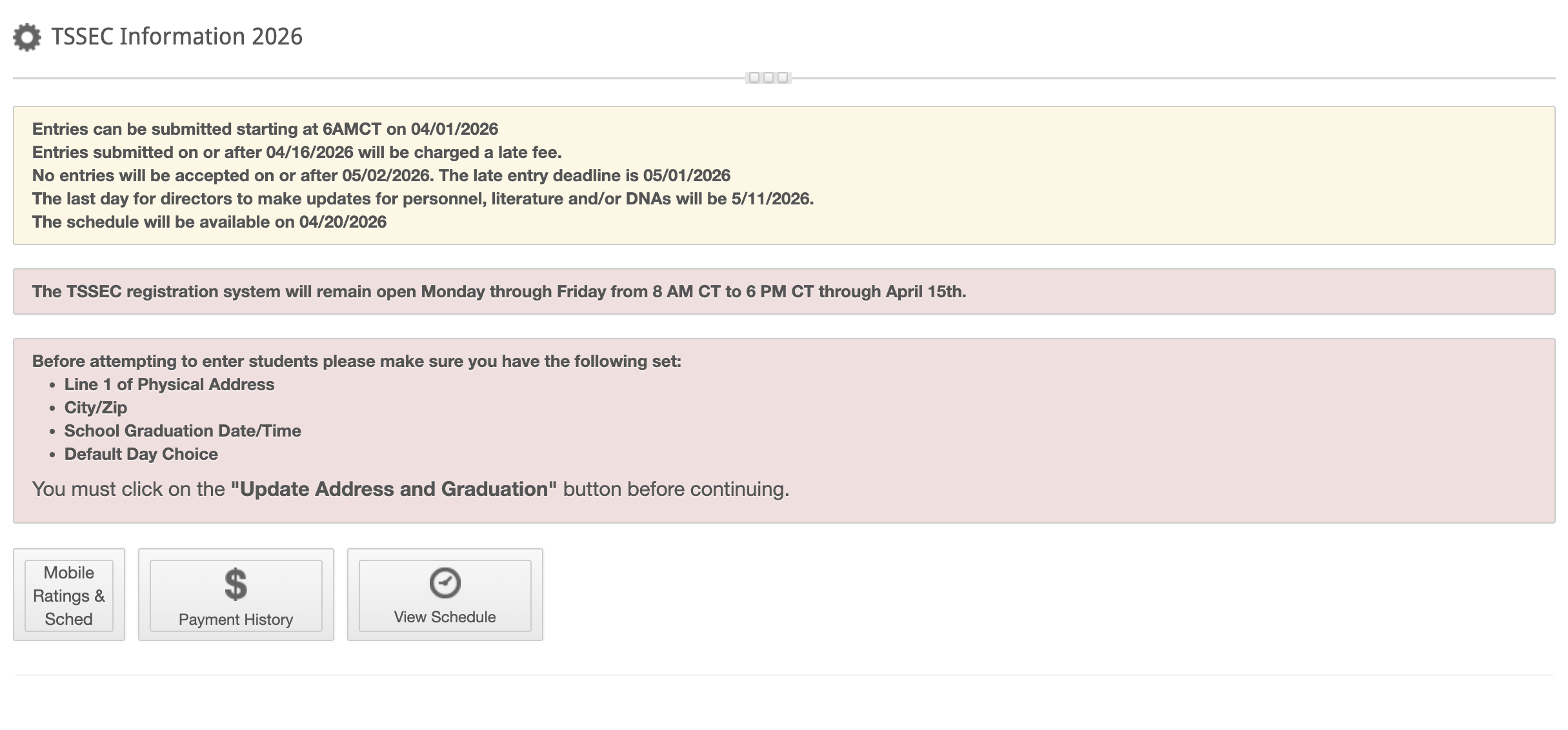 Registration generally opens on April 1, but the State Office will post the official registration information in mid-March. The State Office will post messaging inside of texasmusicforms.com, letting users know when registration will open and the deadlines for entering. This is an example of what that looks like.