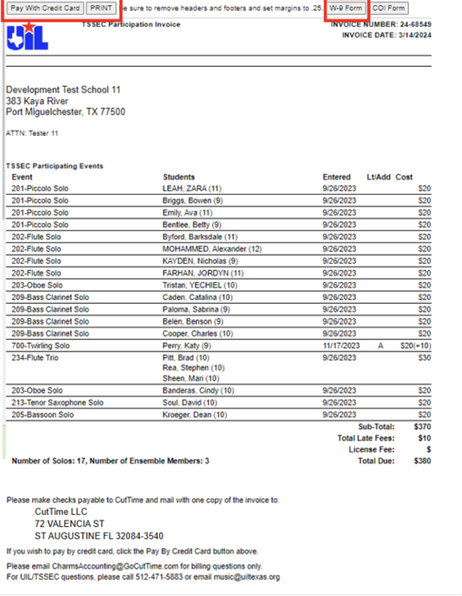 The invoice will in a new tab. Print the invoice or pay it by credit card by clicking the buttons at the top of the invoice. Print a new W-9 form if you need one.