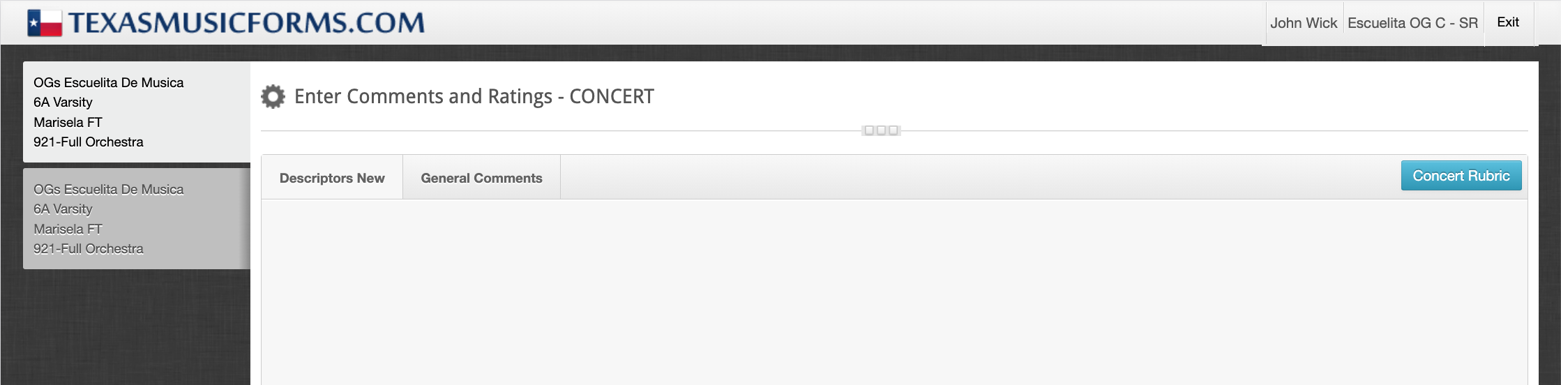 You’ll now see the group’s scoring sheet, which includes a built-in rubric and space for general comments. The rubric is divided into three categories—Tone, Technique, and Musical Understanding—each containing four to five descriptors. Every descriptor provides a dropdown menu with five performance indicators for easy selection.